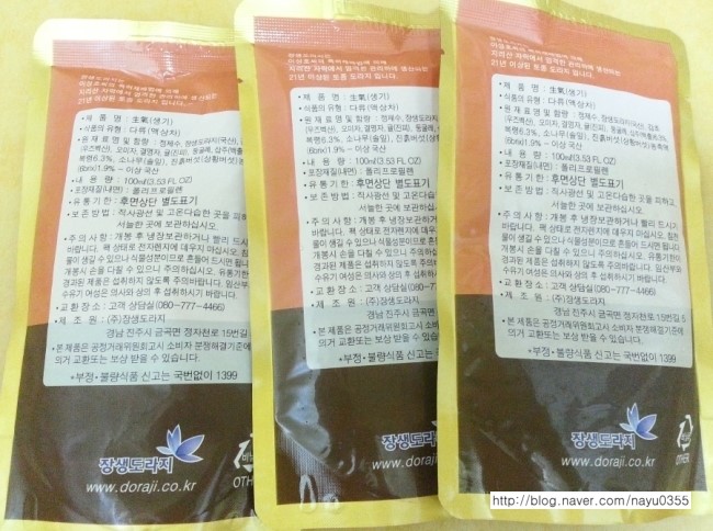 저는 직업이 하루종일 전화받고 사람상대하고 말을 하기 때문에.. 목이 칼칼하고 답답하고 좀 아플때가 많답니다.. 이러고 진을 빼고 나서 집에 가면 녹초가 됩니다.. 사람 상대하고 하루종일 전화 받는것도 체력소모가 많이 되더라구여.. 아침에 출근을 할려면 일어나야 하는데.. 어느날 부터는 도저히 몸이 천근만근이 되어 못 일어나고..지각을 하는날이 많아 졌답니다.. 이러던차에 장생도라지 생기 체험단에 당첨되어 장생도라지 생기 1박스를 받게되었습니다.. 장생도라지 생기 1박스에 30포 들어 있고여..사람에 따라 하루 2번~3회를 복용하게 되어 있답니다.. 하루 3번은 벅찬거 같아서 하루에 1번 또는 2번정도를 복용하고 있고여.. 지금 30포중에 13개를 지금 먹었습니다.. 칼칼하고 답답하던 목은 시원하고 아주 좋고여.. 천근만근인 몸은 조금씩 회복이 되어 아침에 일어나기 수월하더라구여.. 몸은 아직 완전히 회복된건 아닌데..그래도 아침에 일어나기 편안하더라구여.. 장생도라지 생기 그렇게 진하지 않고 향도 독하지 않고..너무 쓰지 않고 먹기에 딱 좋더라구요.. 1포의 양은 100ml 이고..너무 차가우면 그렇고..저는 살짝 데펴서 먹고 있는데.. 먹기 불편하지 않고 괜찮아요..지속적으로 먹으면 몸이 아주 좋아지겠더라구여.. 저한테는 장생도라지 생기가 맞더라구여...몸에도 잘 받고...잘 먹고 있습니다..감사합니다..^^ ![]()
