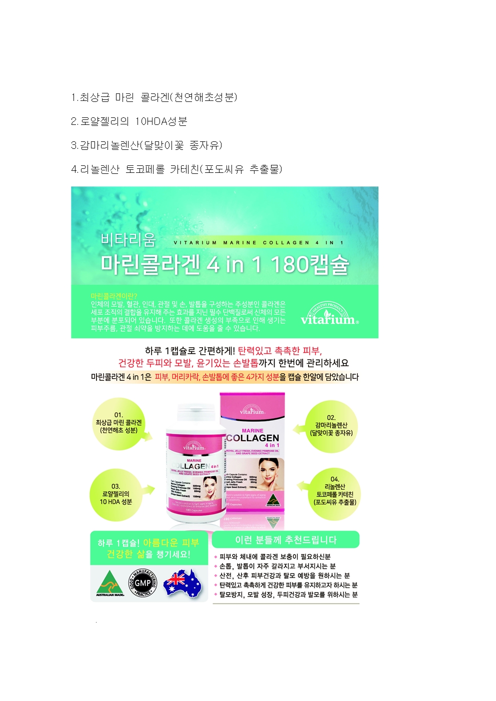 마린콜라겐천연해초류, 로얄제리, 감마리놀렌산(달맞이 꽃 종자유), 포도씨유 추출물로 구성된 피부관리에 도움을 주는 콜라겐. 6개월분