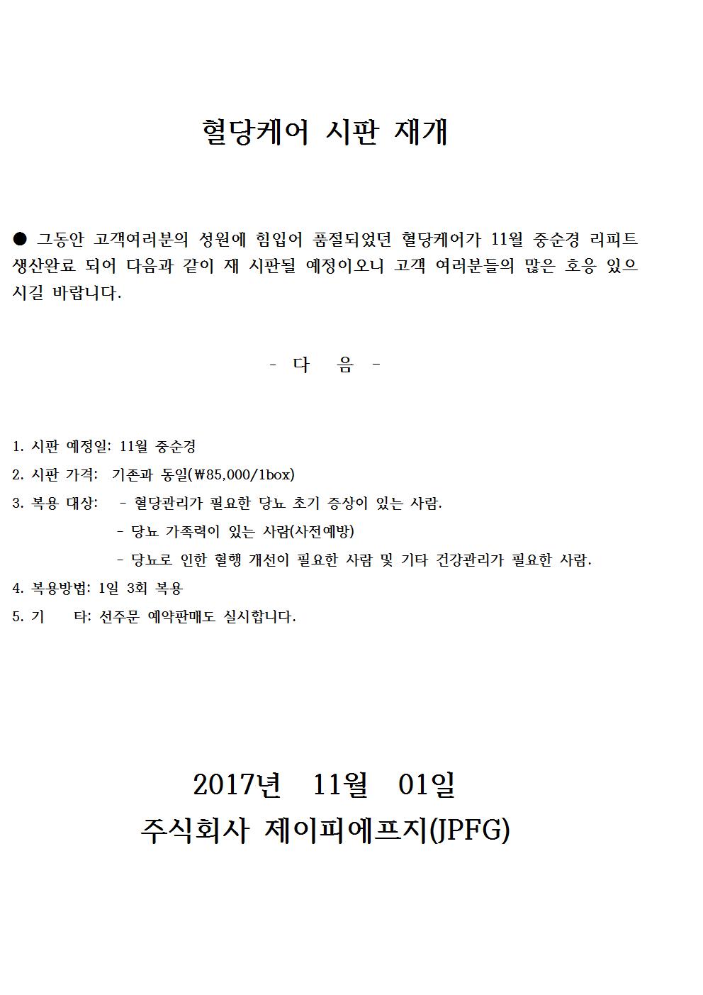 | 제목 | 혈당케어 시판 재개 | ||||