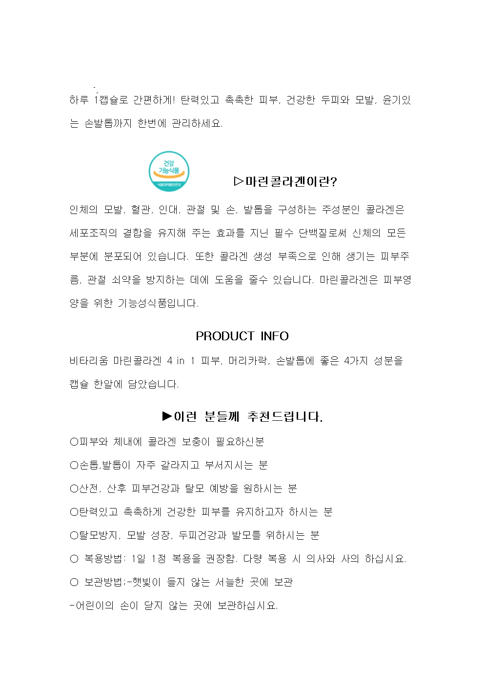 마린콜라겐천연해초류, 로얄제리, 감마리놀렌산(달맞이 꽃 종자유), 포도씨유 추출물로 구성된 피부관리에 도움을 주는 콜라겐. 6개월분
